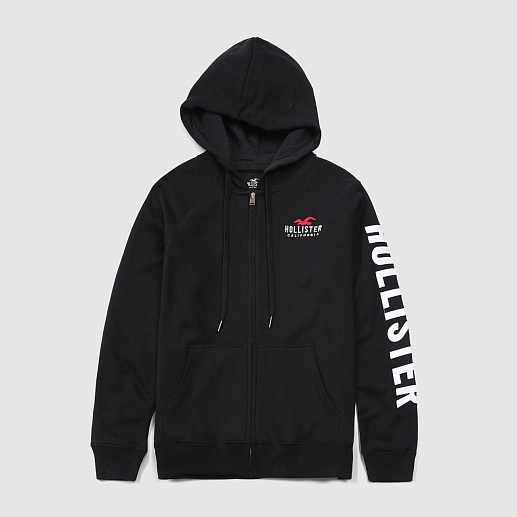 Удобная мужская толстовка черного цвета Holister с капюшоном на шнурках. Спереди застёжка-молния, два кармана, аппликация на рукаве и вышивка логота.